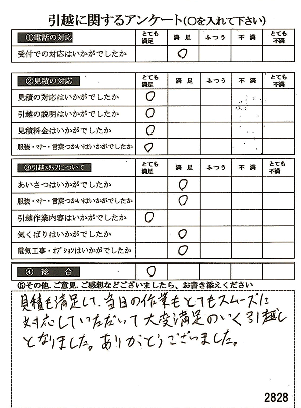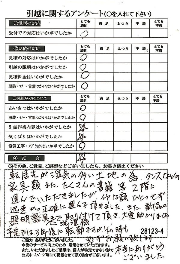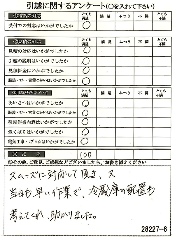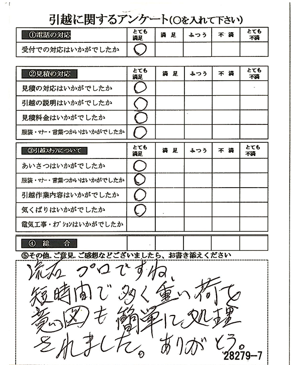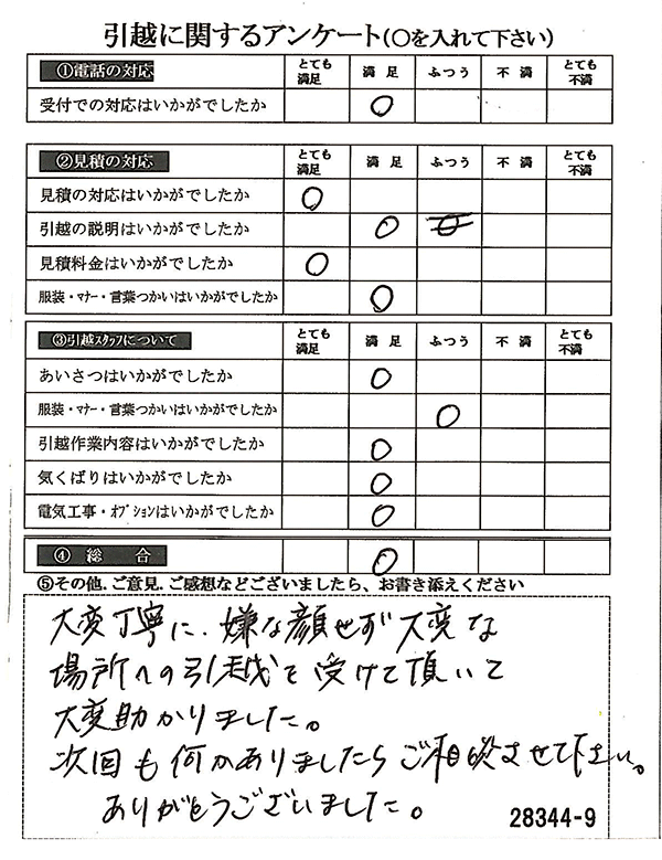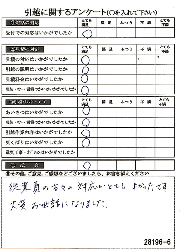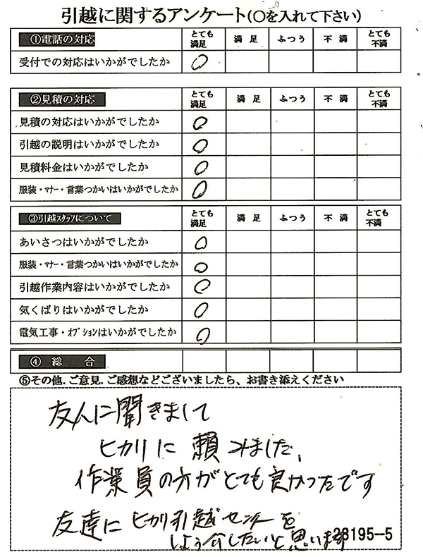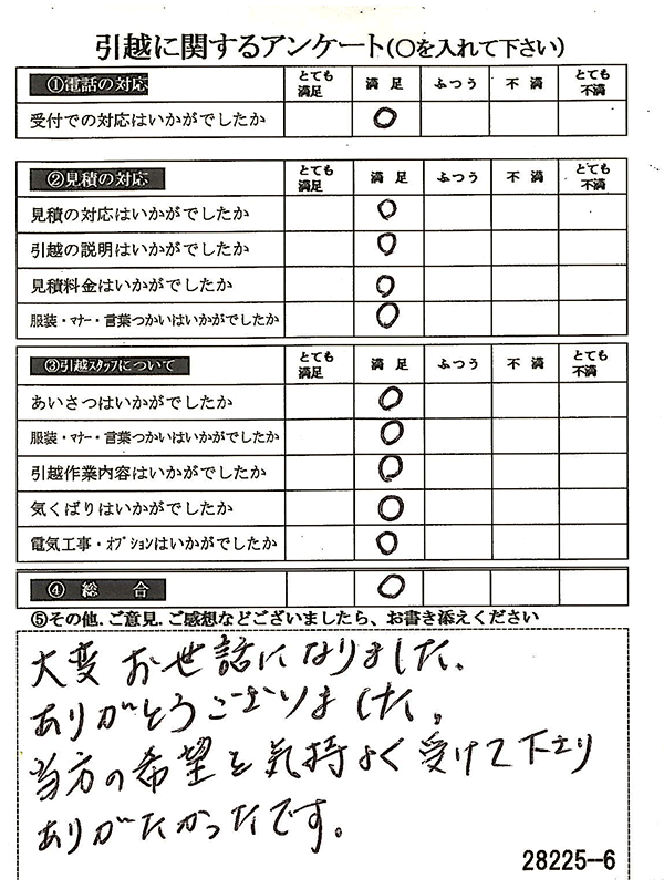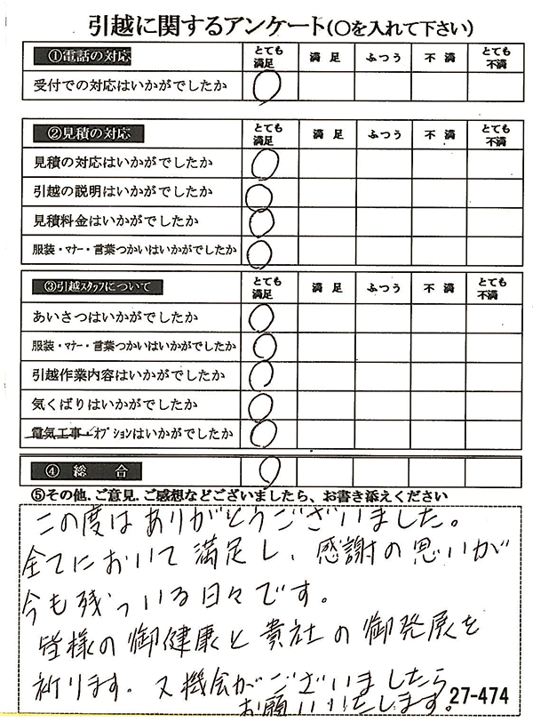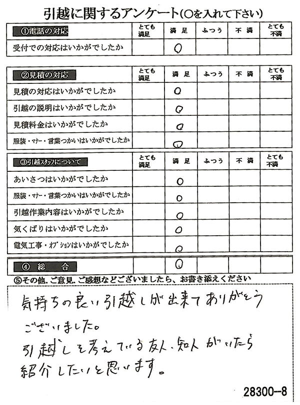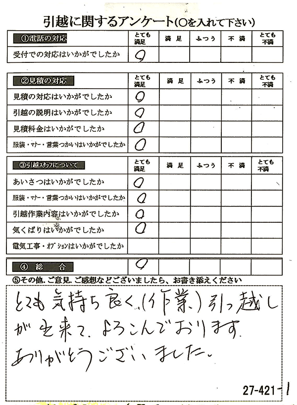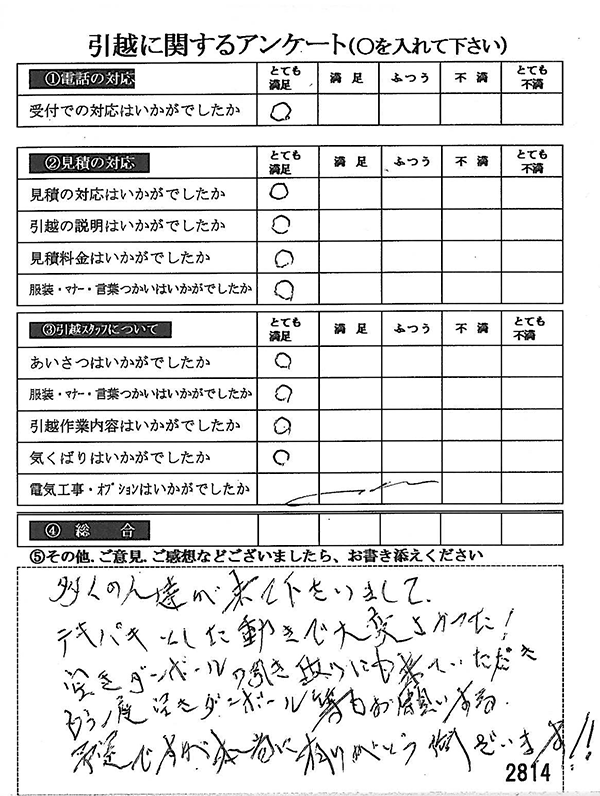 〇〇様からお送り頂きましたアンケートハガキを早速スタッフ一同拝見させて頂き、オール「とても満足」に、〇〇様のお引越に携わらせていただきました受付・営業・作業スタッフ全員嬉しく、そのようにおっしゃっていただけて、心より感謝申し上げます。またのご利用お待ちしております。