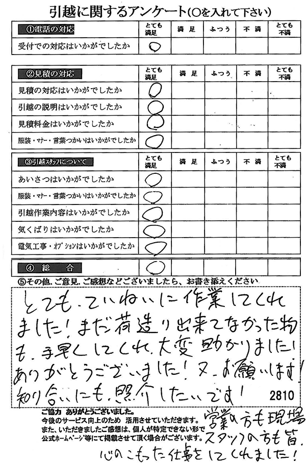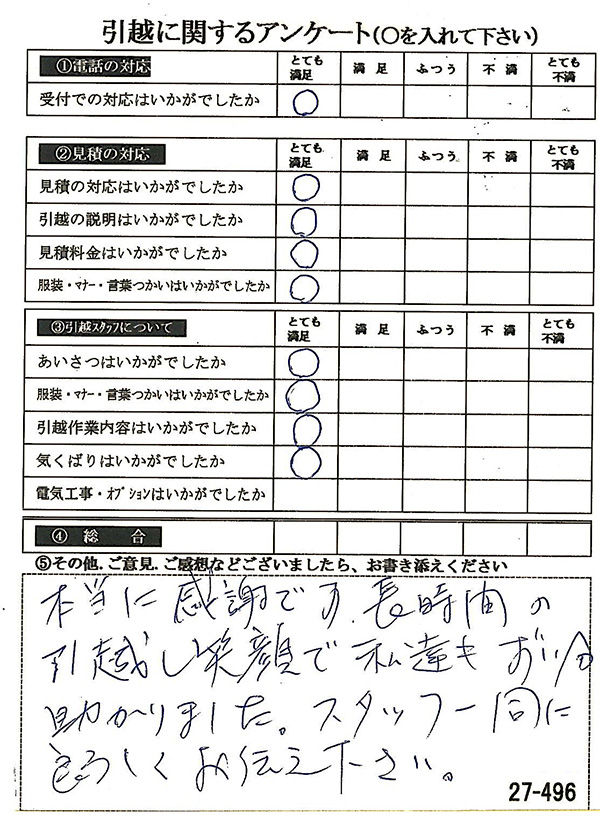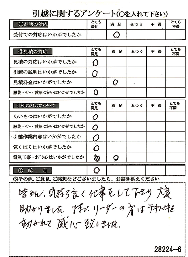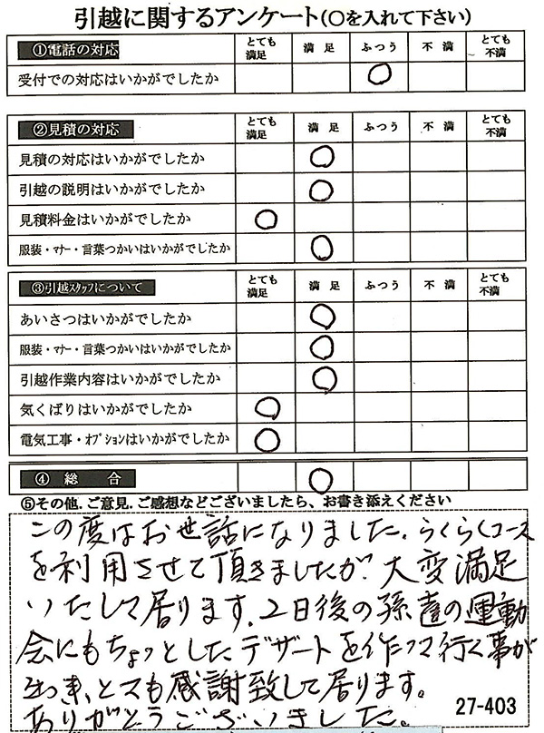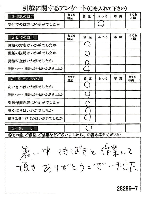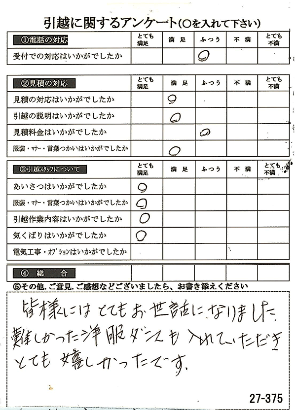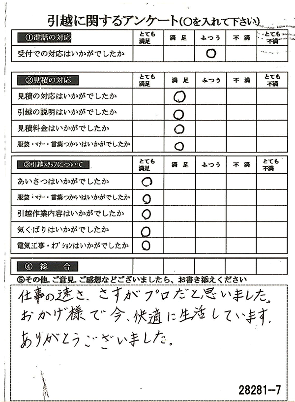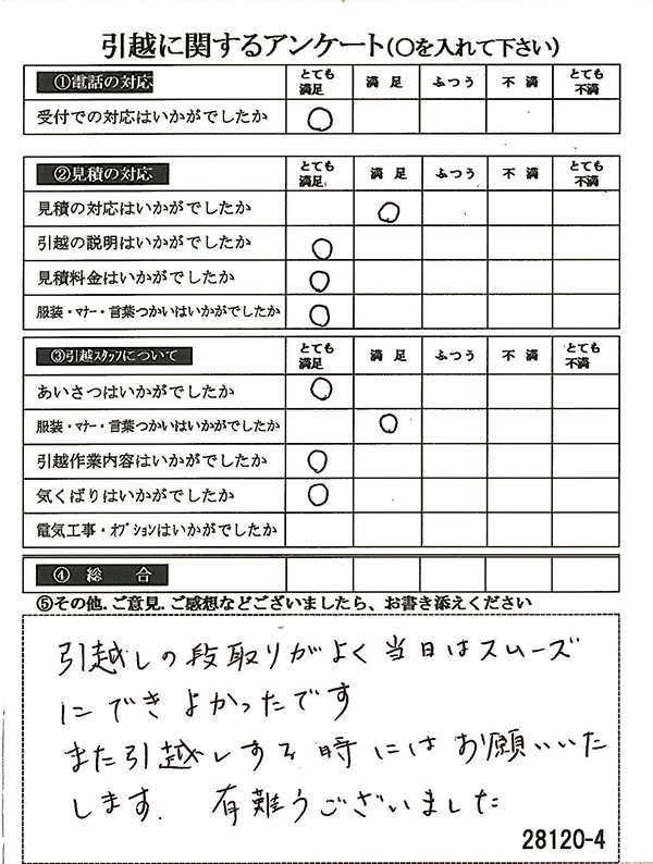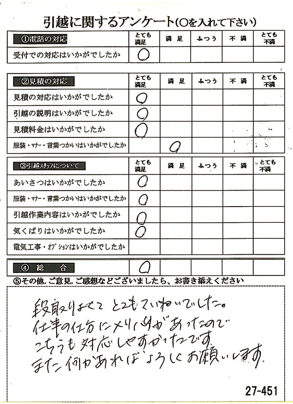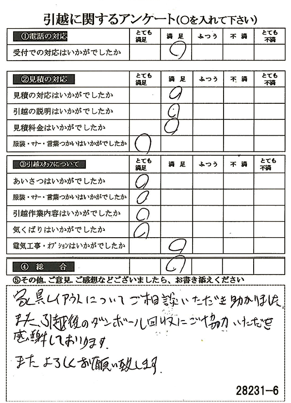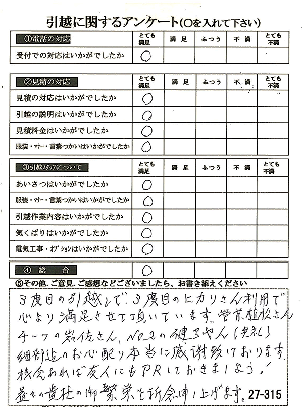 〇〇様からお送り頂きましたアンケートハガキを早速スタッフ一同拝見させて頂き、オール「とても満足」に、〇〇様のお引越に携わらせていただきました受付・営業・作業スタッフ全員嬉しく、そのようにおっしゃっていただけて、心より感謝申し上げます。またのご利用お待ちしております。