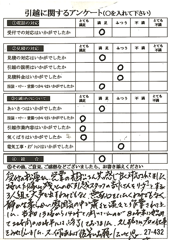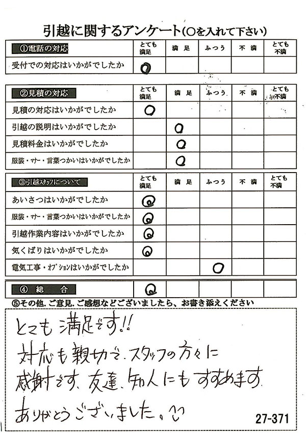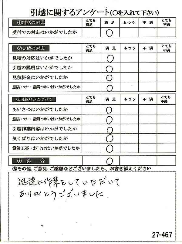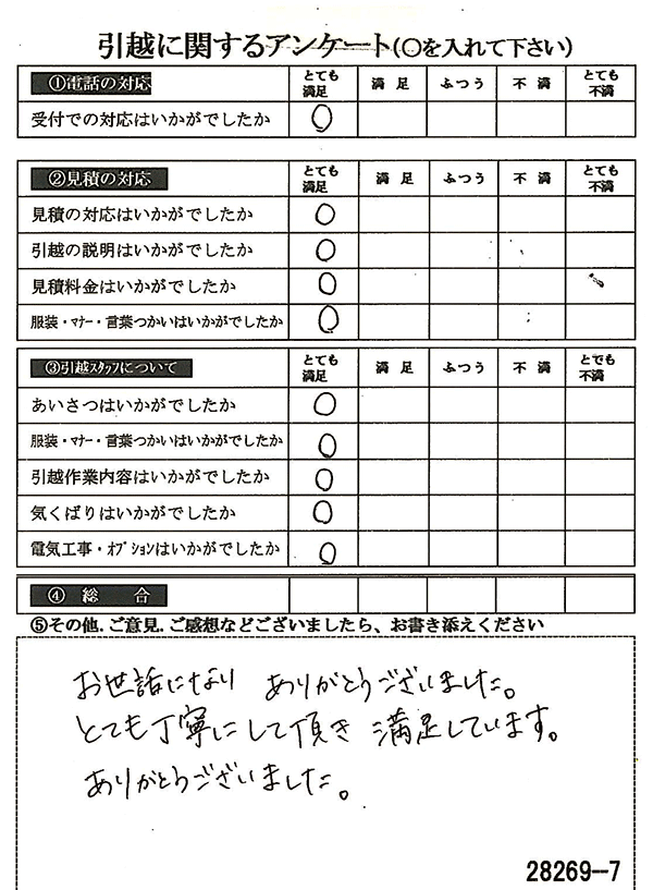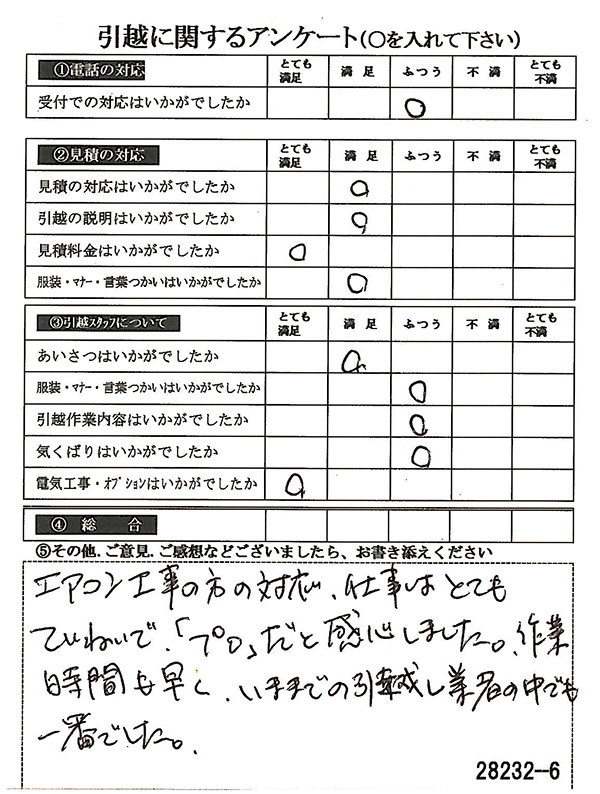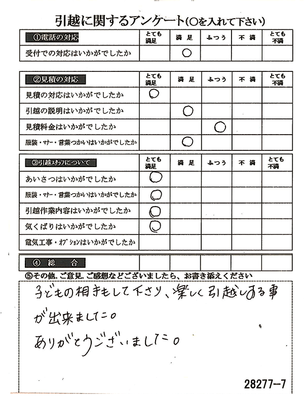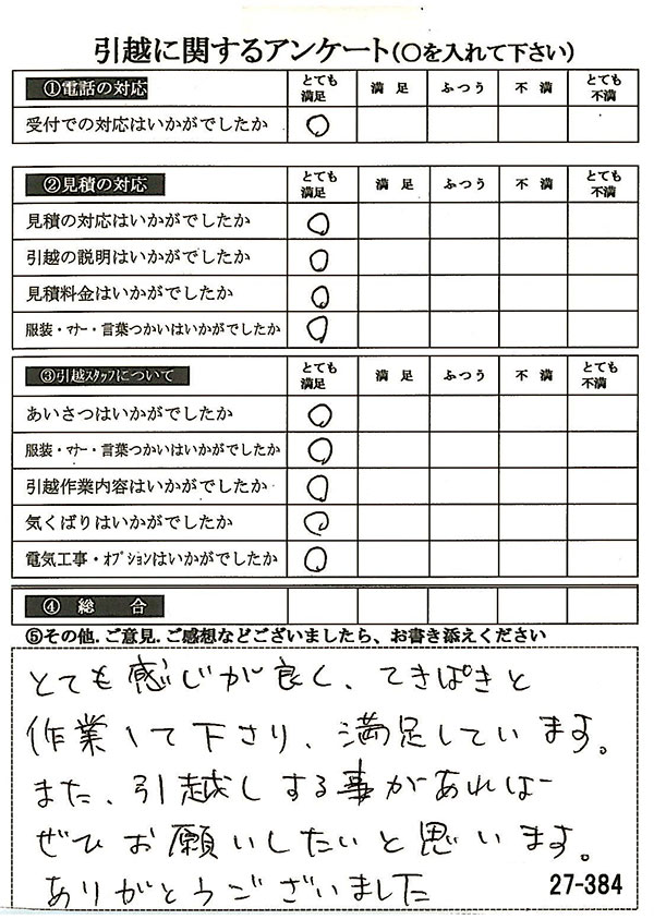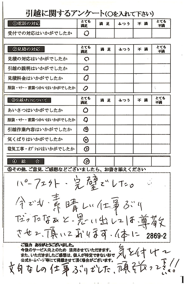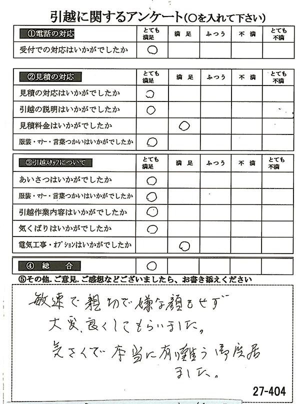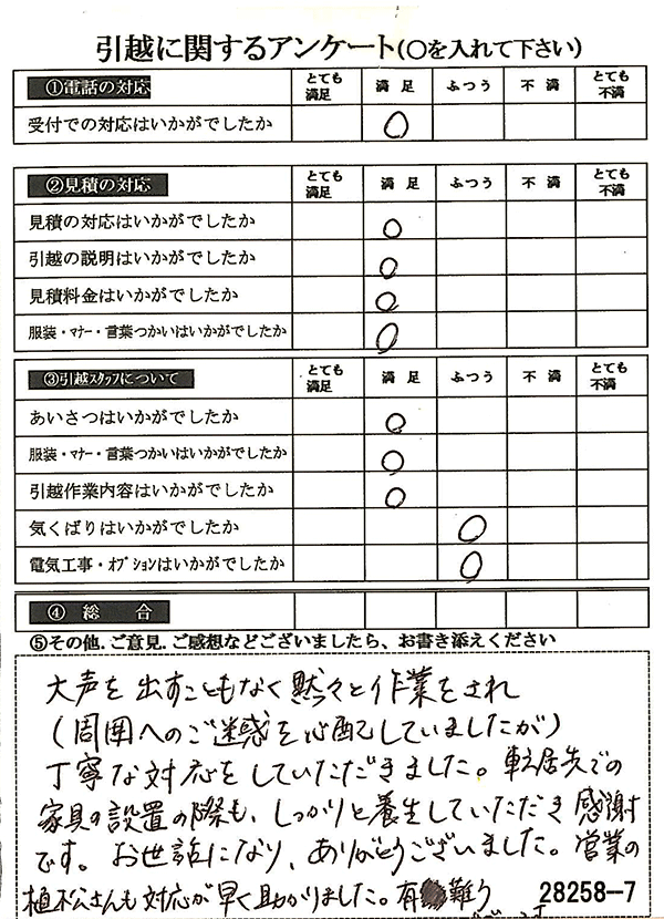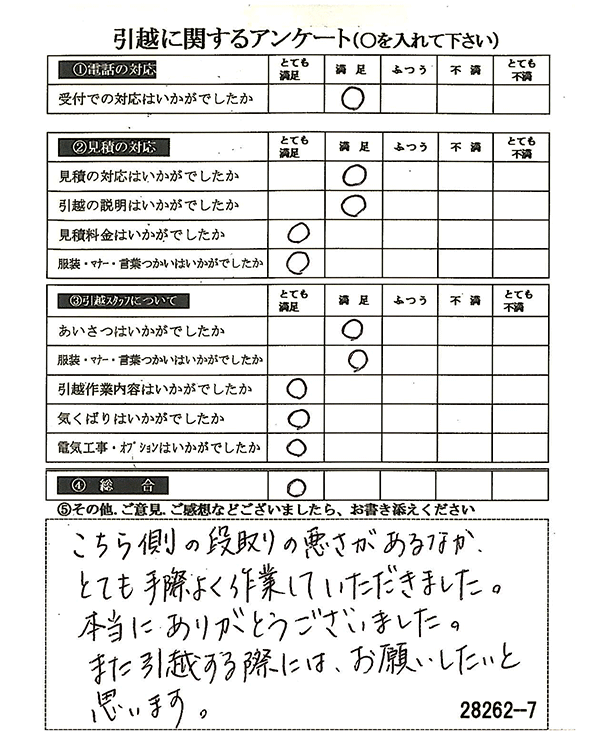 〇〇様からお送り頂きましたアンケートハガキを早速スタッフ一同拝見させて頂き、オール「とても満足」に、〇〇様のお引越に携わらせていただきました受付・営業・作業スタッフ全員嬉しく、そのようにおっしゃっていただけて、心より感謝申し上げます。またのご利用お待ちしております。