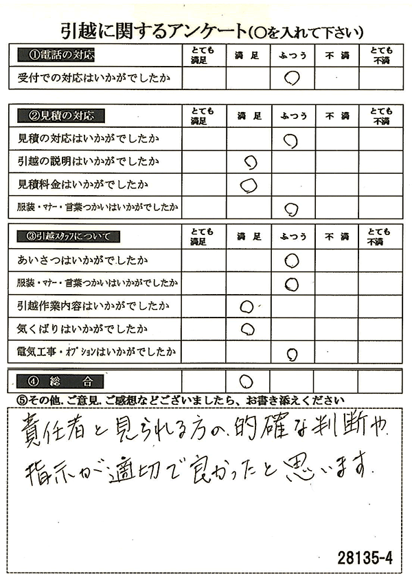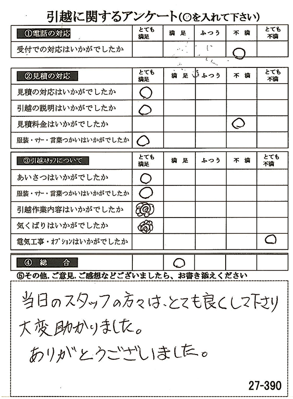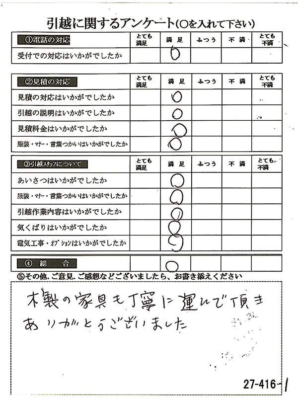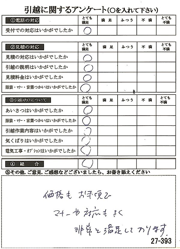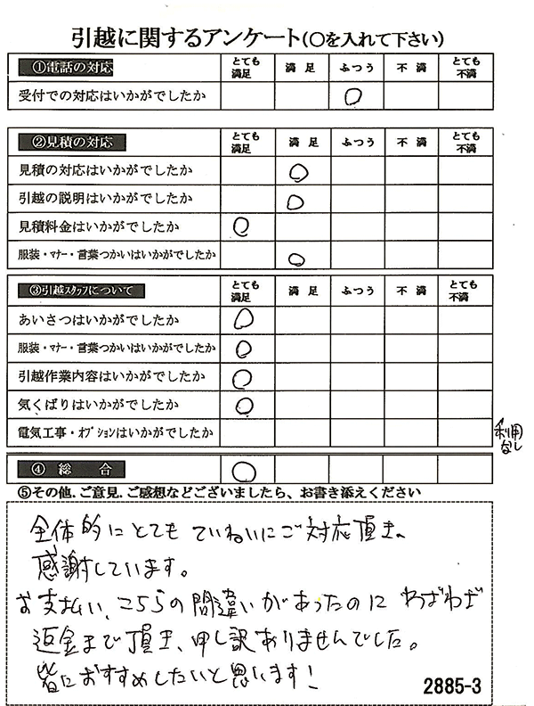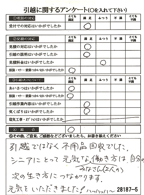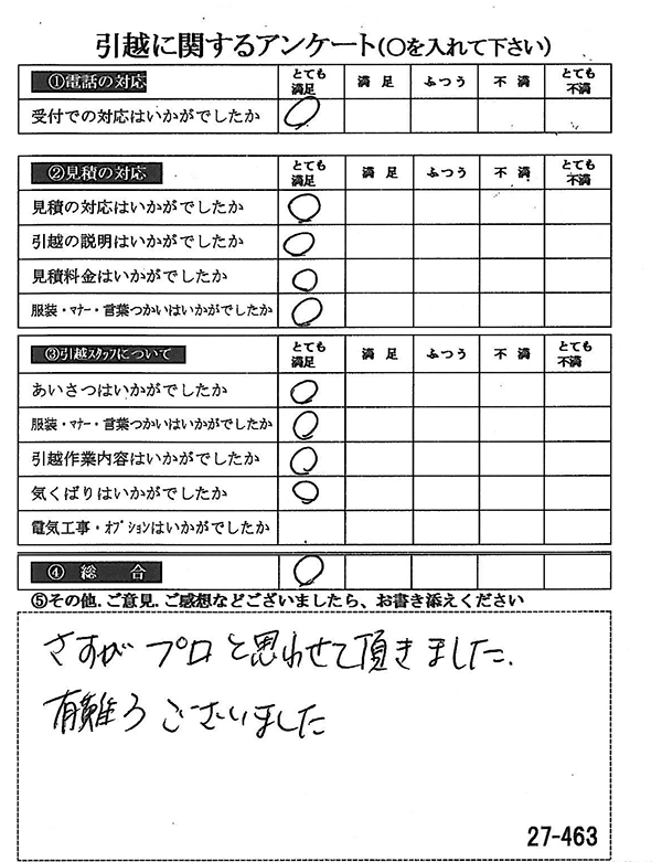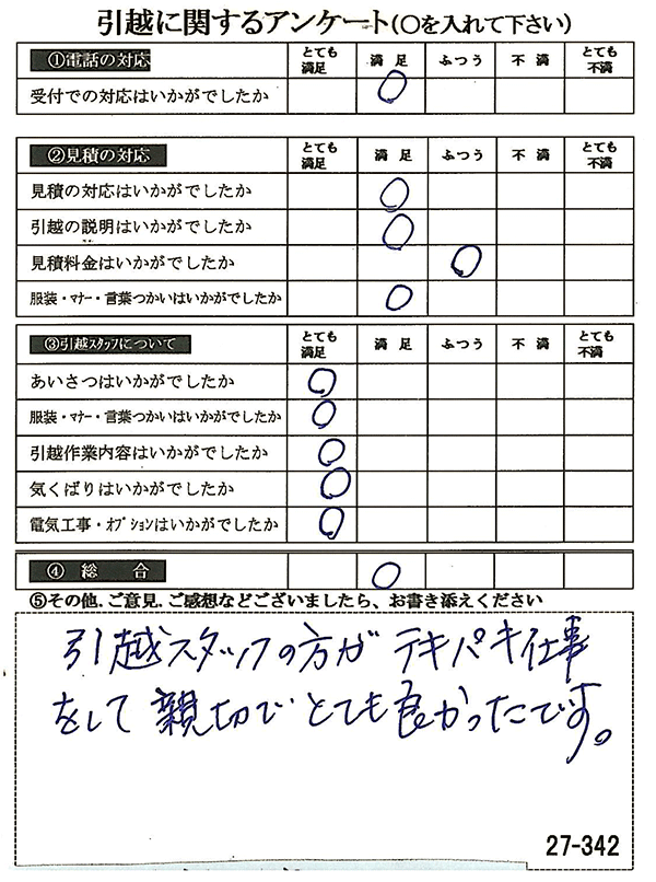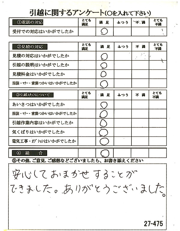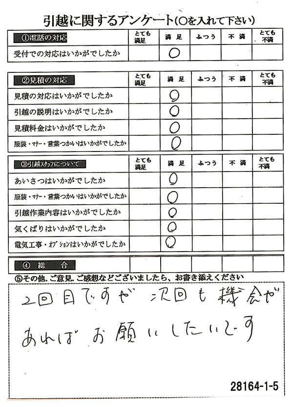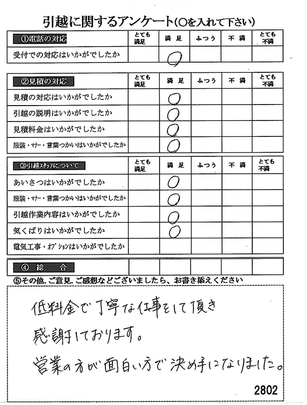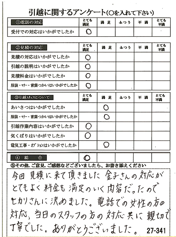 〇〇様からお送り頂きましたアンケートハガキを早速スタッフ一同拝見させて頂き、オール「とても満足」に、〇〇様のお引越に携わらせていただきました受付・営業・作業スタッフ全員嬉しく、そのようにおっしゃっていただけて、心より感謝申し上げます。またのご利用お待ちしております。