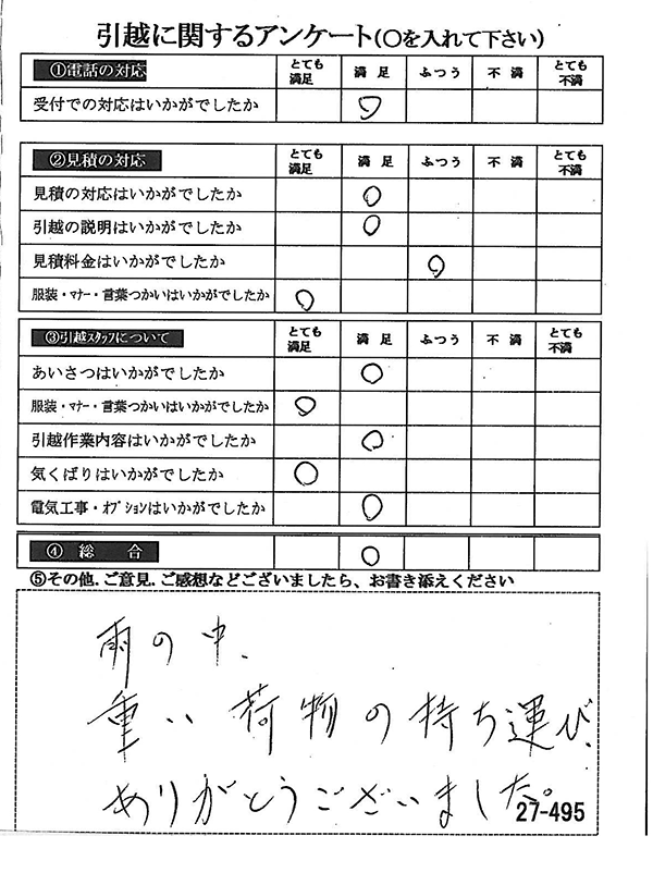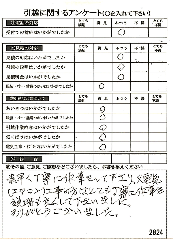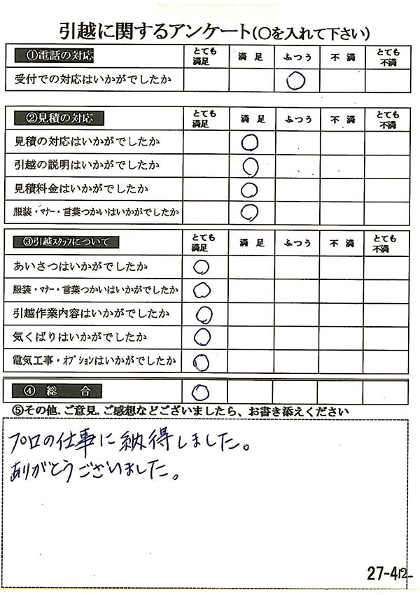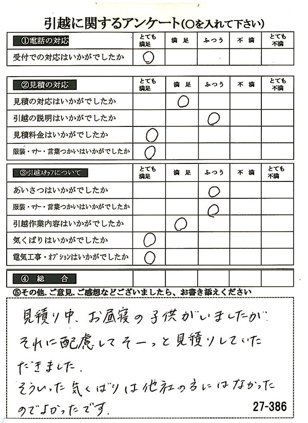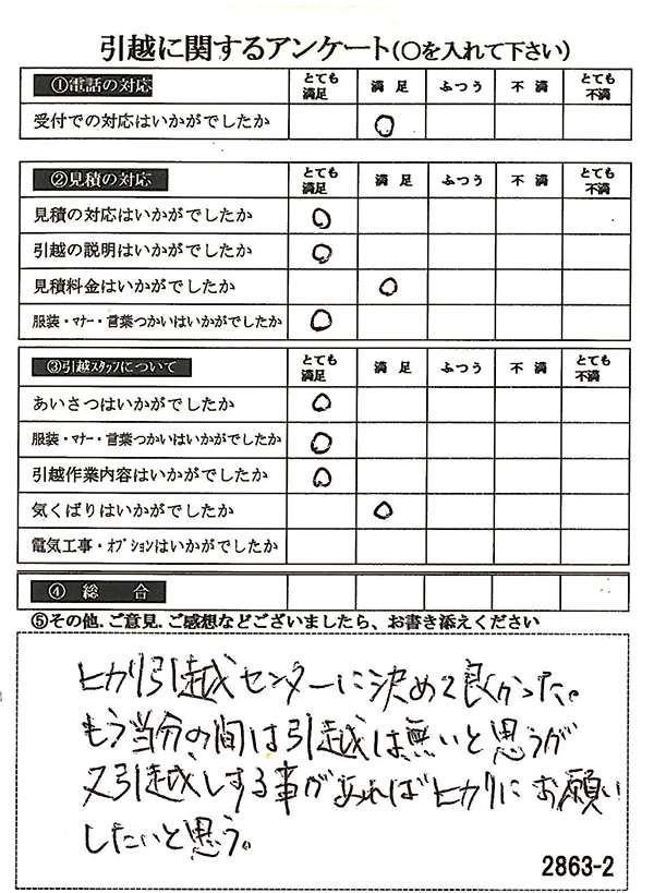 見積も満足して、当日の作業もとてもスムーズに対応していただいて大変満足のいく引越しとなりました。ありがとうございました。