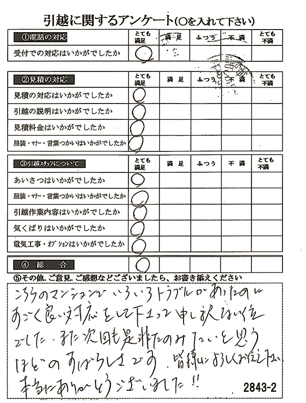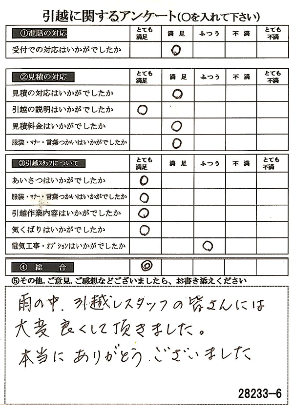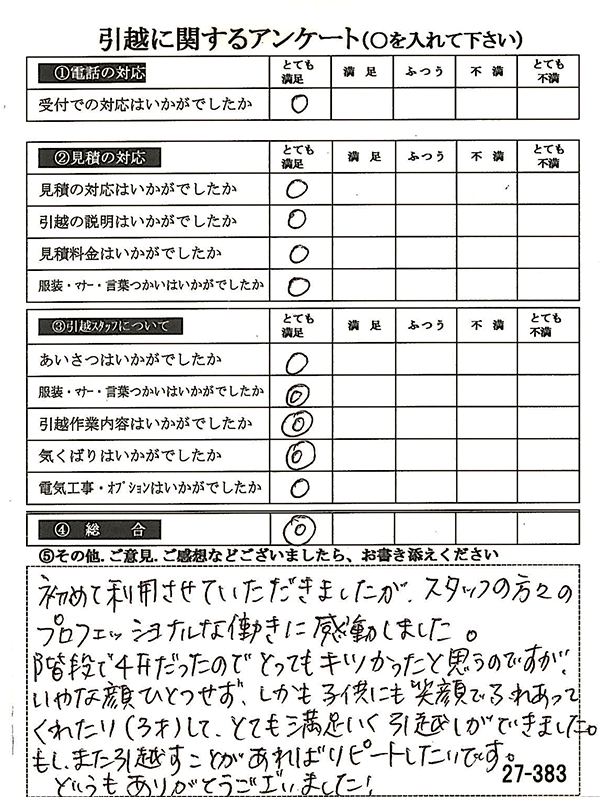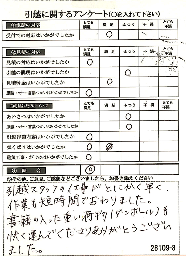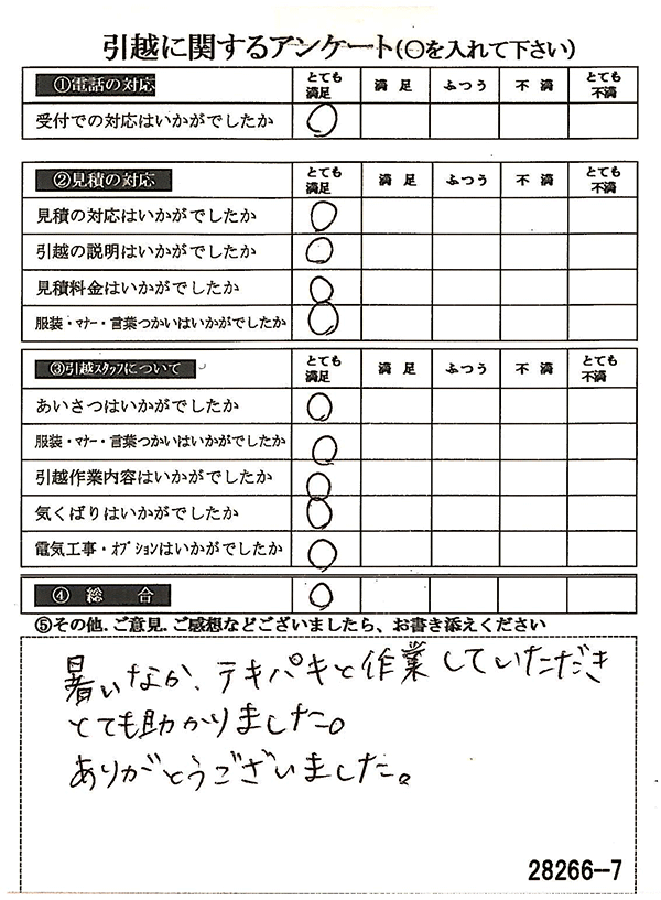 全項目「とても満足」のご回答をいただき、しかも引越作業内容や気くばりなど、総合も◎をいただき、とても嬉しく思います♪