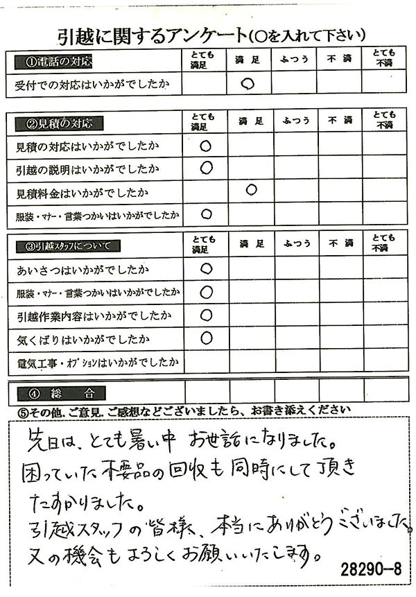 先日は、とても暑い中、お世話になりました。 困っていた不要品の回収も同時にして頂き、たすかりました。 引越スタッフの皆様、本当にありがとうございました。 又の機会もよろしくお願いいたします。