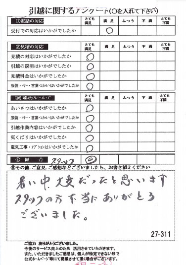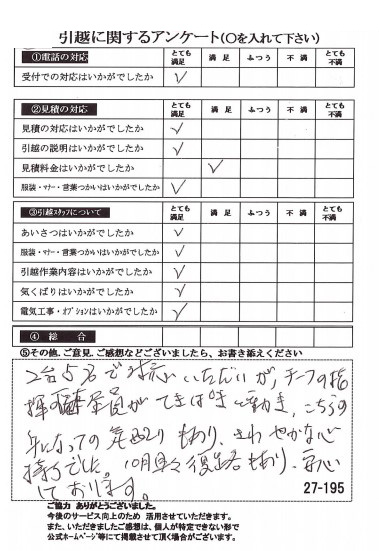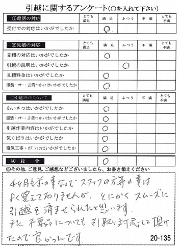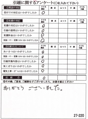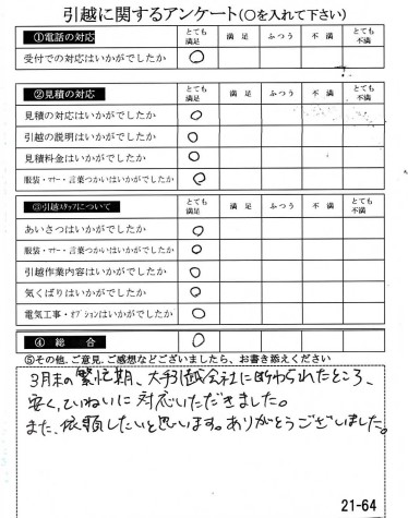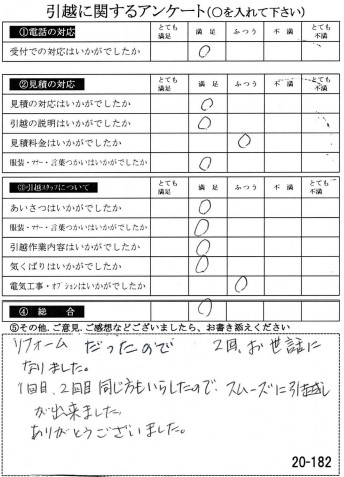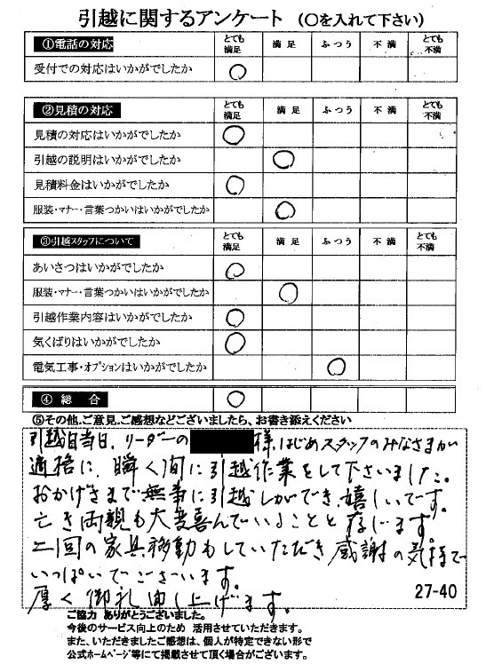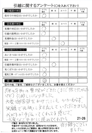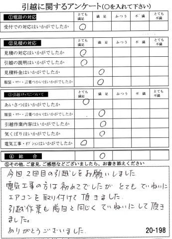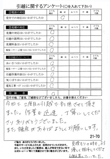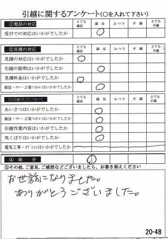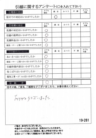 〇〇様のお引っ越しをお手伝いさせて頂きこちらこそ誠にありがとうございました。