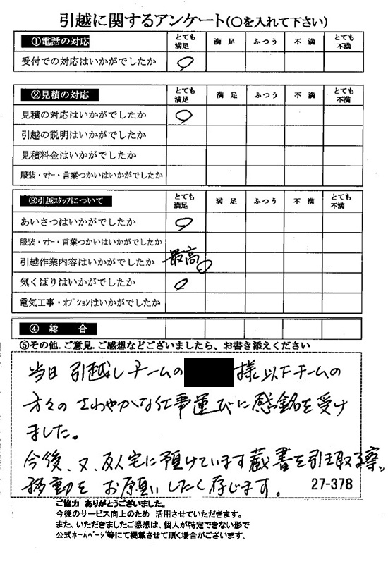 当日、引越しチームの●●様以下チームの方々のさわやかな仕事運びに感銘を受けました。今後、又、友人宅に預けています蔵書を引き取る際、移動をお願いしたく存じます。