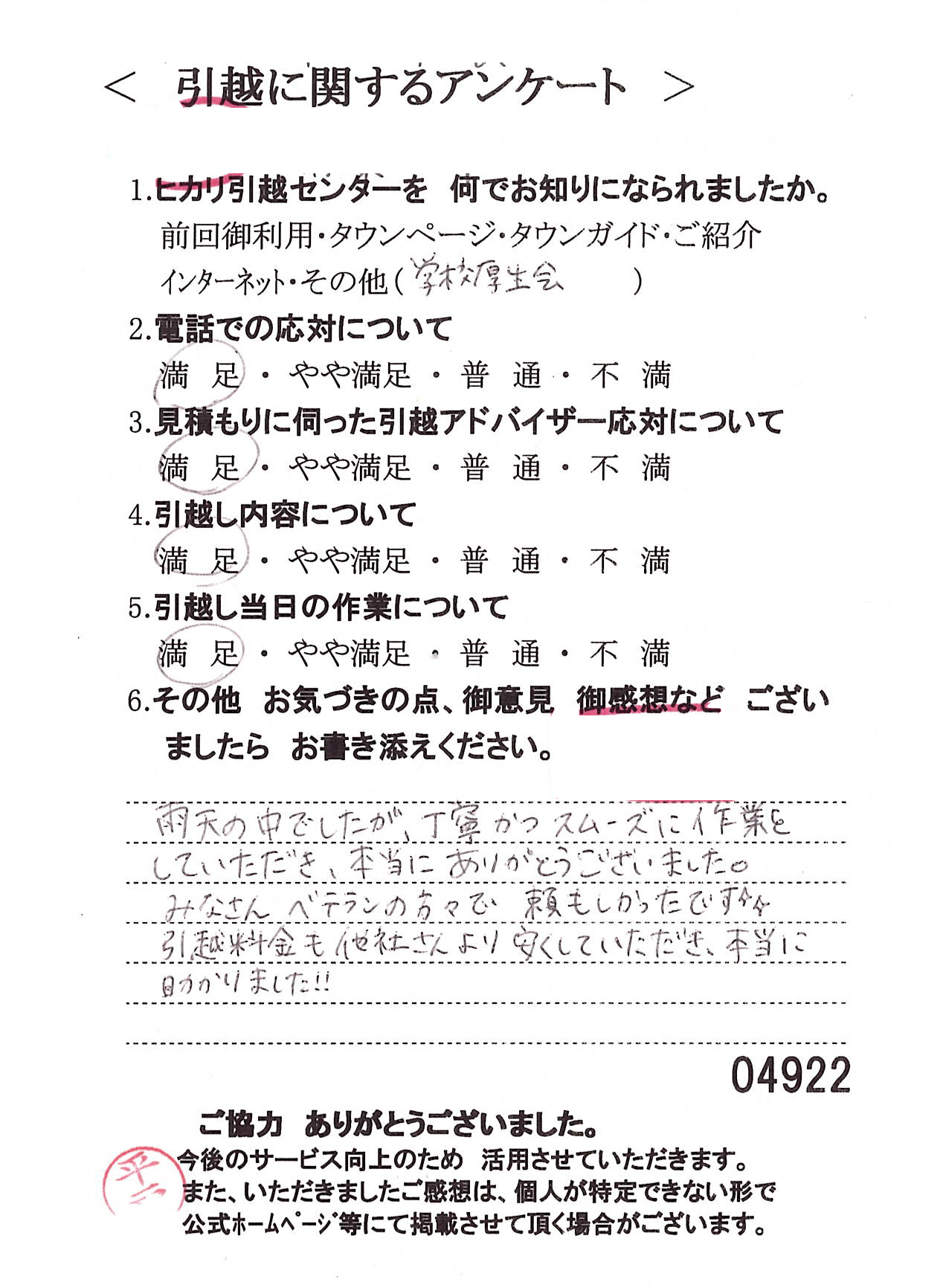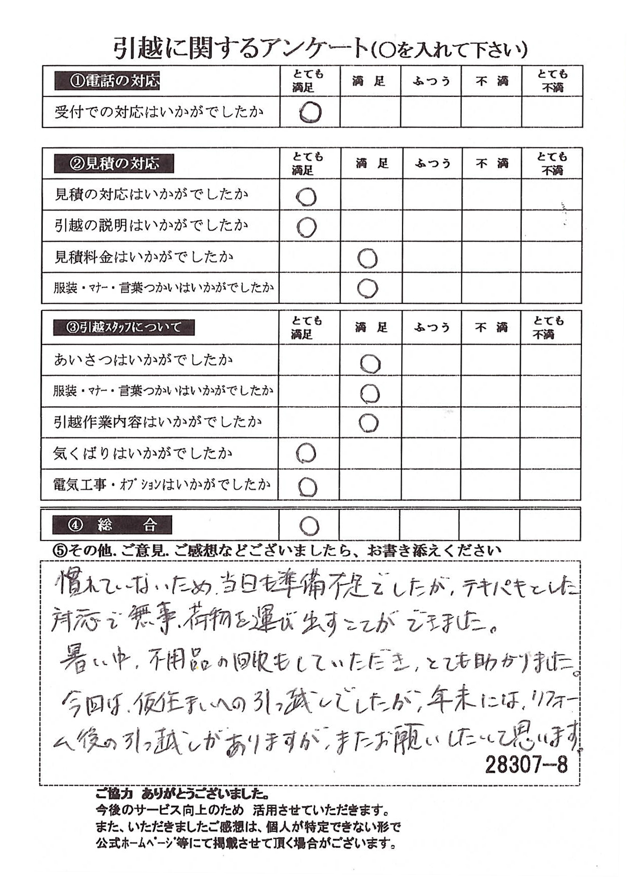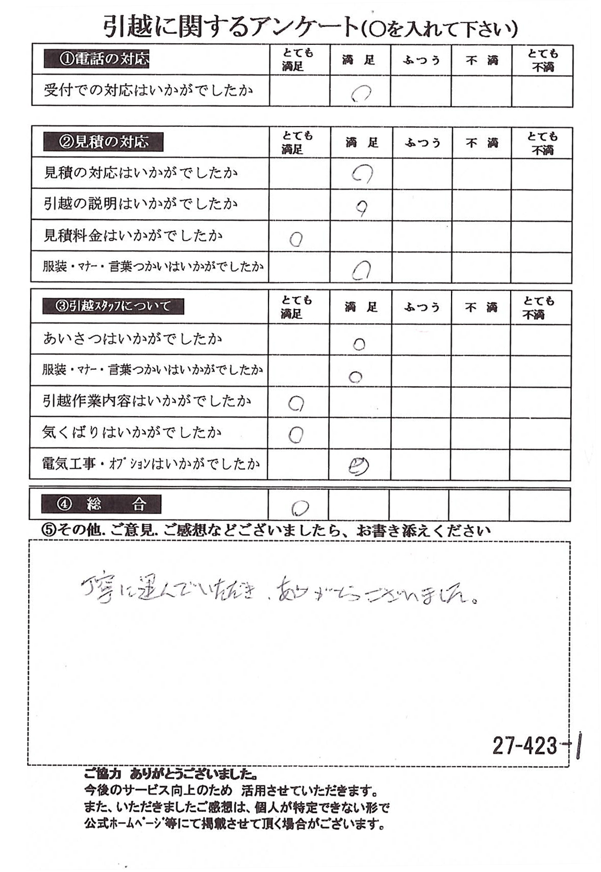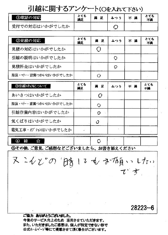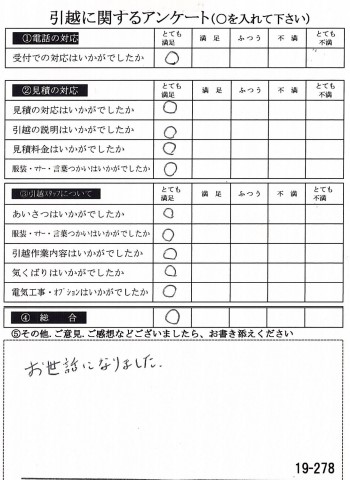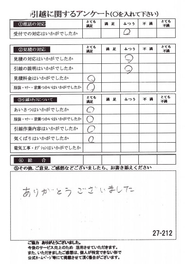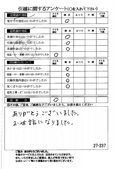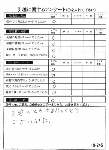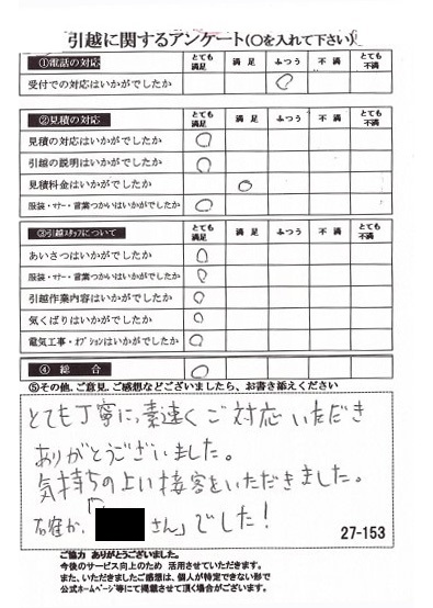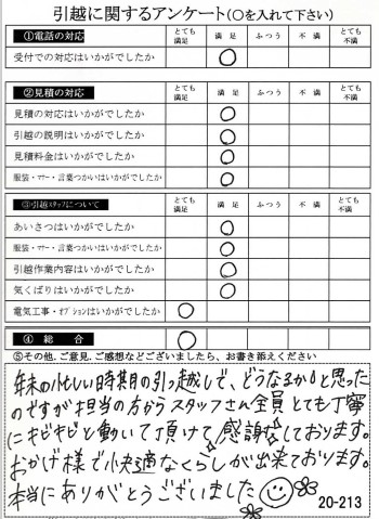この度は数多くの引越し業者から当社をお選びいたただき誠にありがとうございました。イラスト付きのアンケートハガキに心がほっこりしました(^^)