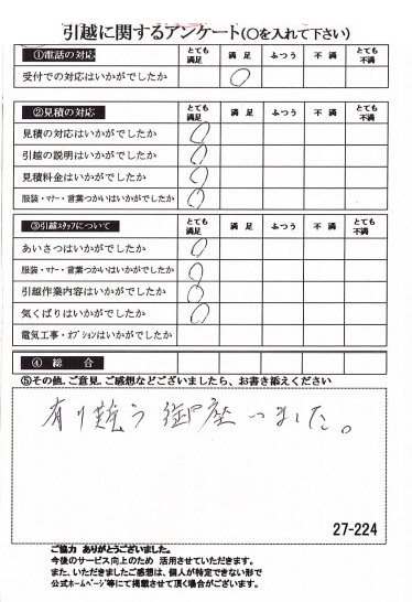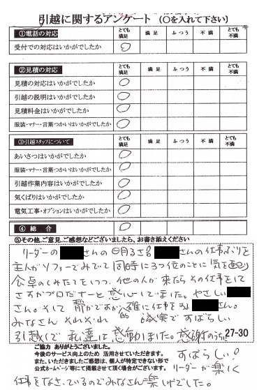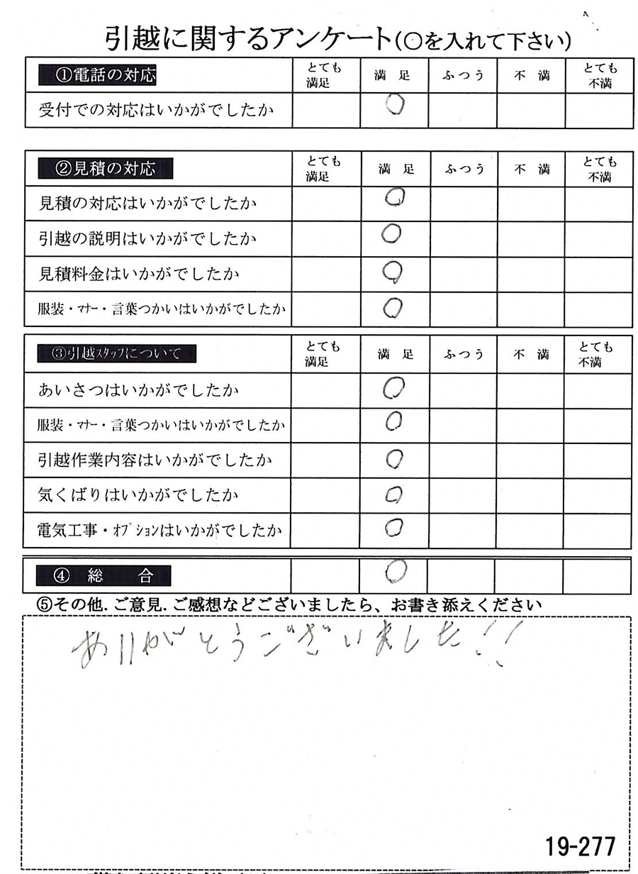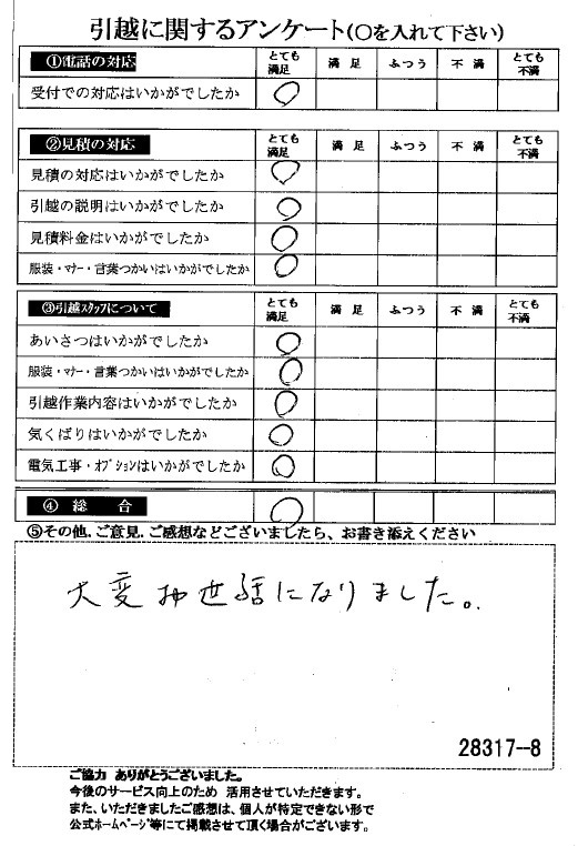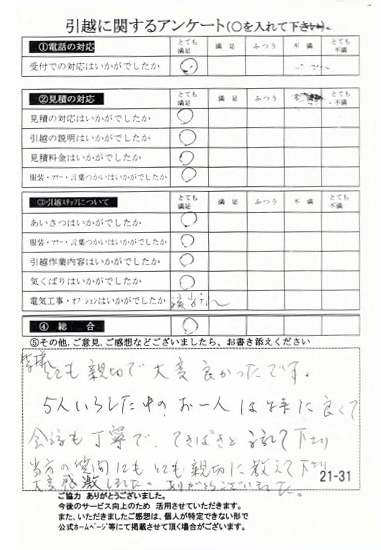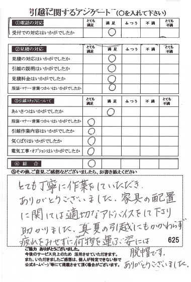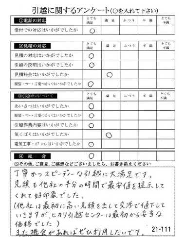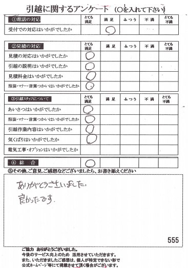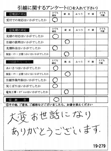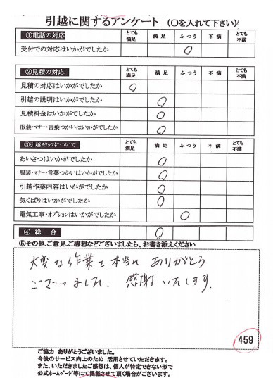 この度は数ある業者の中からヒカリ引越センターにご依頼いただき有難うございました。オール「とても満足」評価をいただき心より感謝いたします。また機会がありましたら是非ご利用ください。