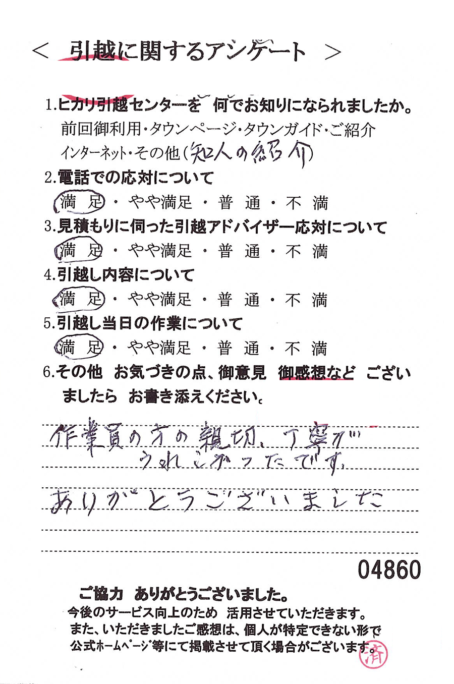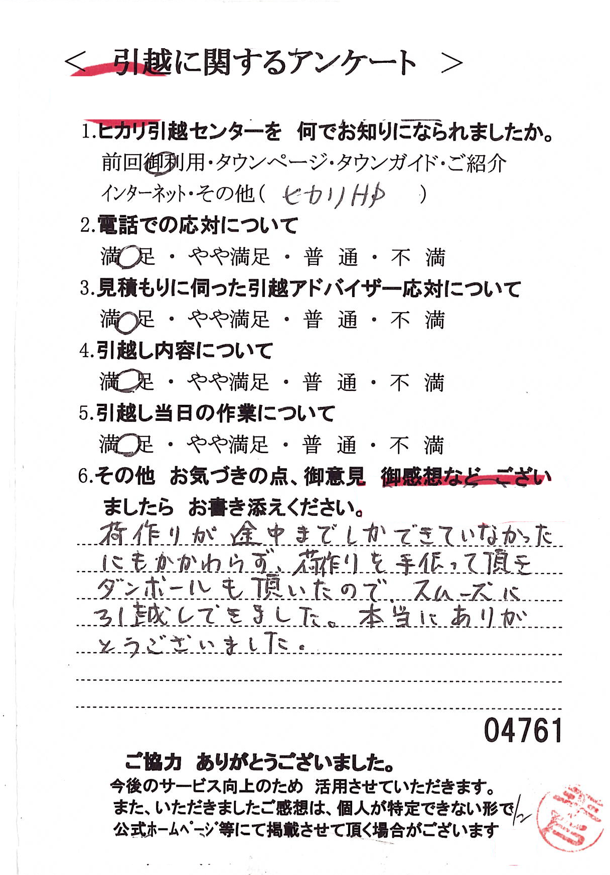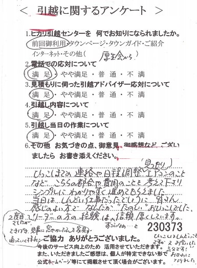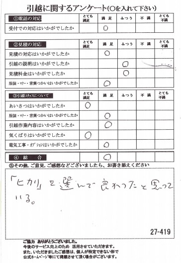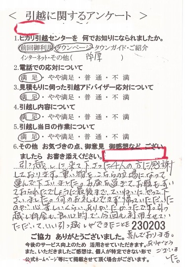 この度は数ある引越業者の中からヒカリ引越センターをお選びいただき誠にありがとうございました。
