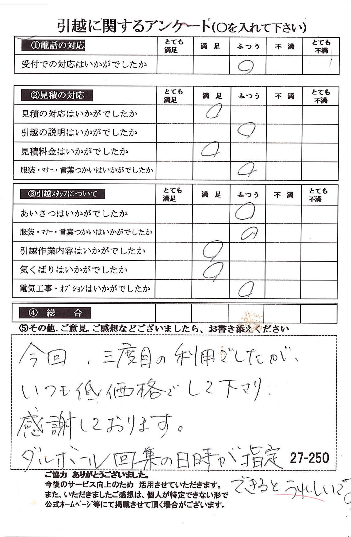 リピートのご利用ありがとうございます。今回のお引っ越しもスムーズにお運びできて安堵しております。