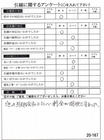 他社比較の引越し作業費用もご満足をいただけて嬉しく思います。また何か機会がございましたらお気軽にお問い合わせください。