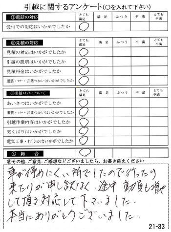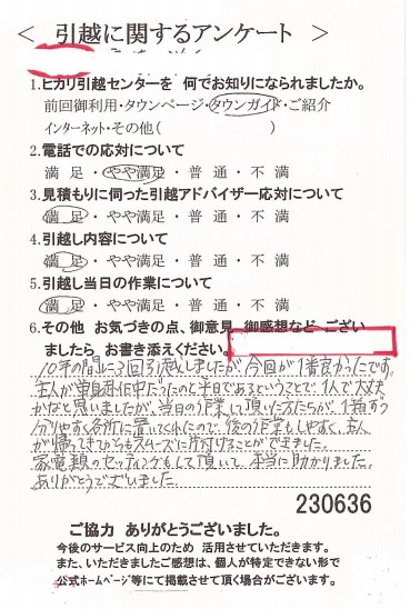 当日はしんどい仕事だったでしょうに、皆さん感じのよい方で、なんだか“たのしい”おひっこしでした。2度目でしたが、てきぱき見事に窓やかいだんを家具が通っていく様子にリーダーの方の経験はすごいな・・・と信頼厚くしています。ひっこしはしんどいことですが、又、お会いしたい気分です!おせわになりました。