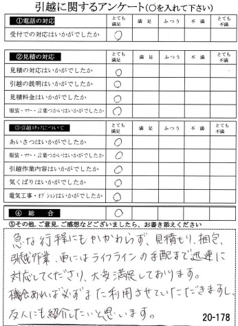 急な行程にもかかわらず、見積もり、梱包、引越作業、更にはライフラインの手配まで迅速に対応してくださり、大変満足しております。