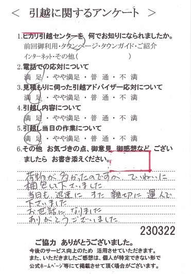 この度はヒカリ引越センターにご依頼いただき誠にありがとうございました。