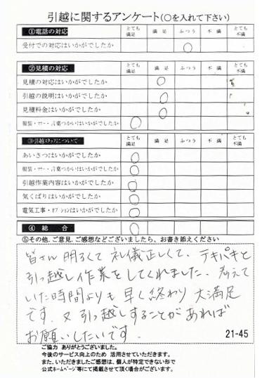 皆さん明るくて礼儀正しくて、テキパキと引っ越し作業をしてくれました。考えていた時間よりも早く終わり大満足です。又引っ越しすることがあればお願いしたいです。