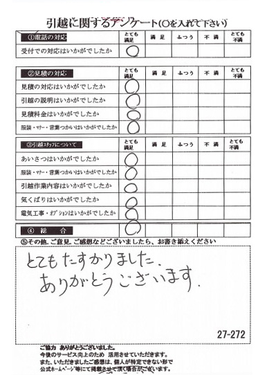 慣れないお引っ越し作業で、荷作り大変だったと思いますが、スムーズに終了して安堵しております。また何かございましたらお気軽にお問い合わせください。