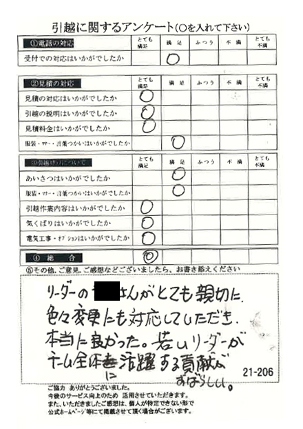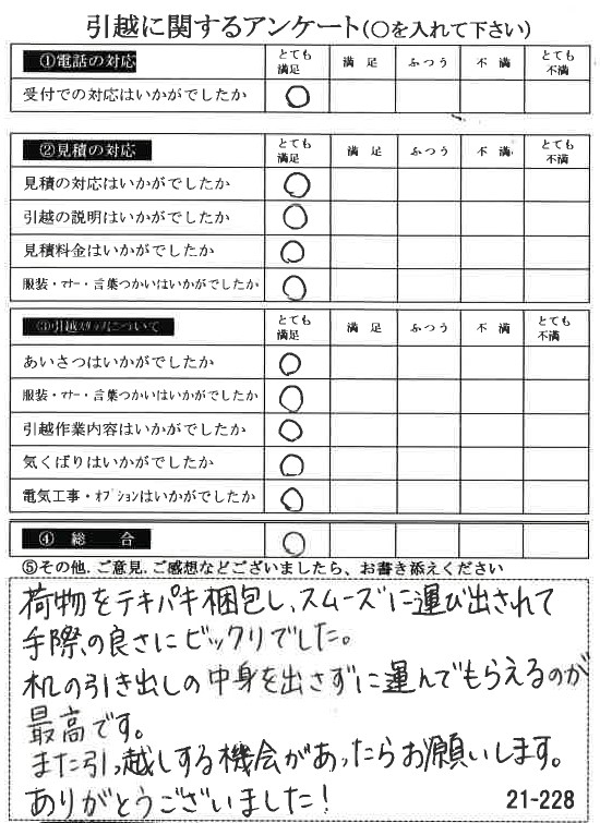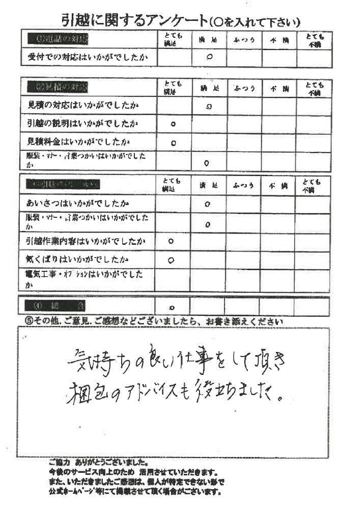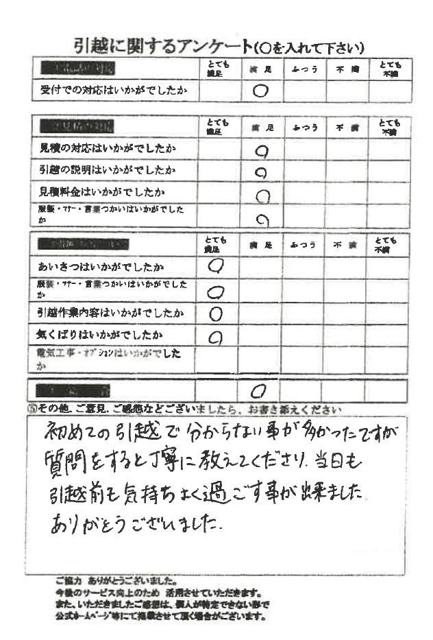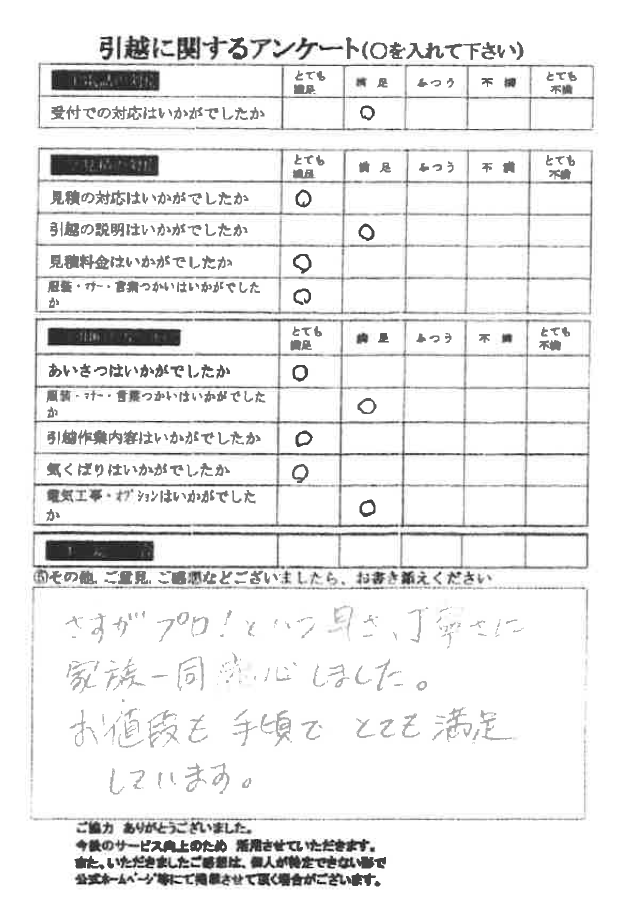 全ての評価に「とても満足」をいただき大変うれしく思います。引越し当日もお気遣いいただき誠にありがとうございました。暑い夏のお引っ越しですが、私達は慣れていますのでスタッフ全員元気です(^^)/またのご利用をお待ちしております。