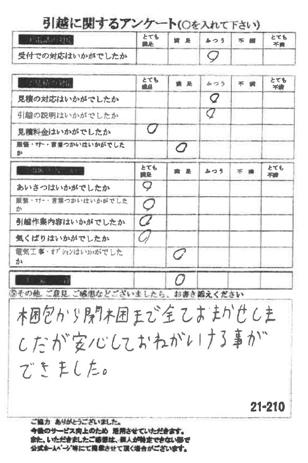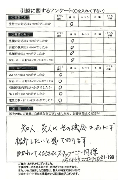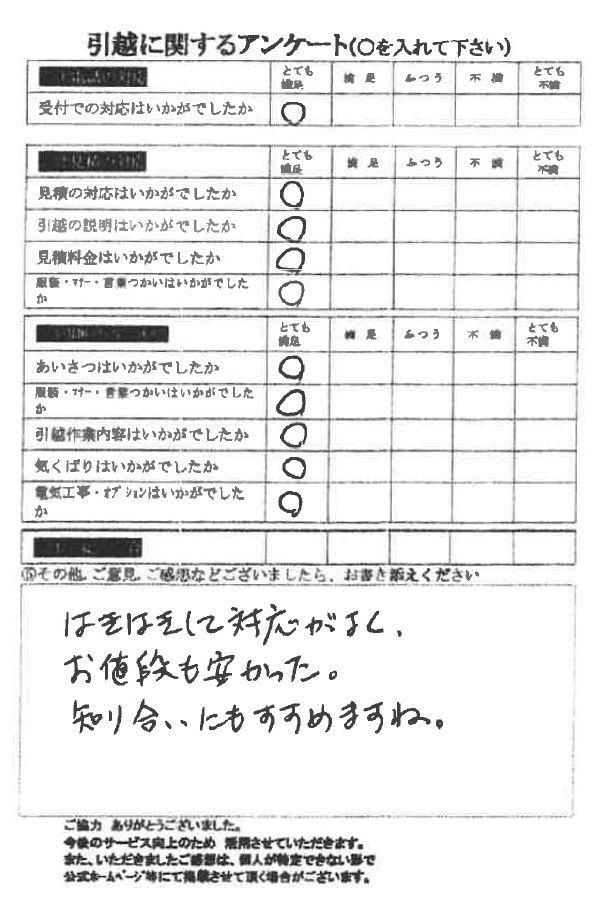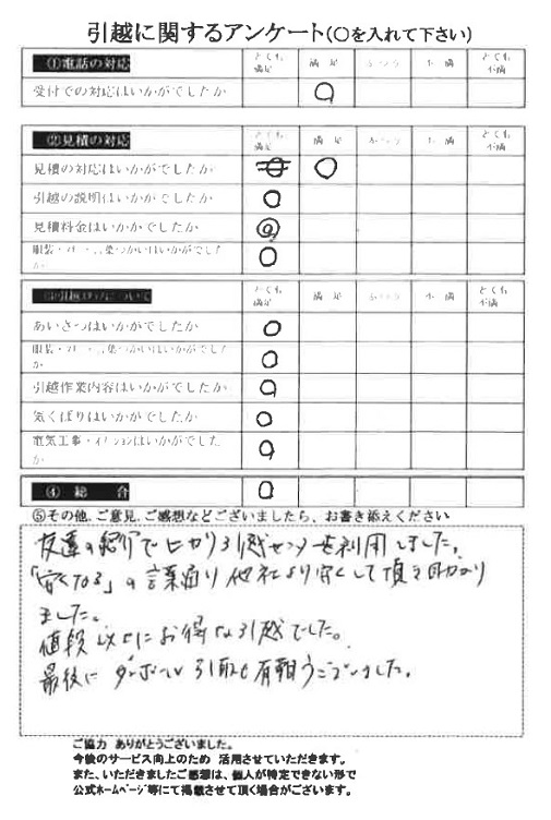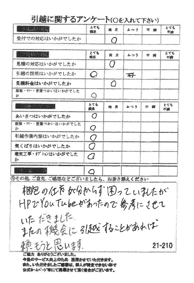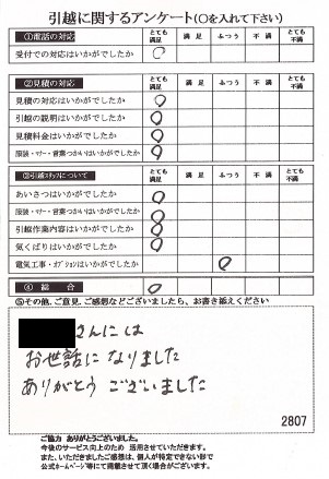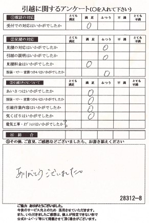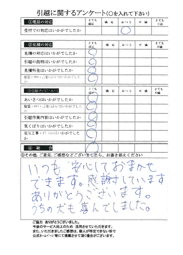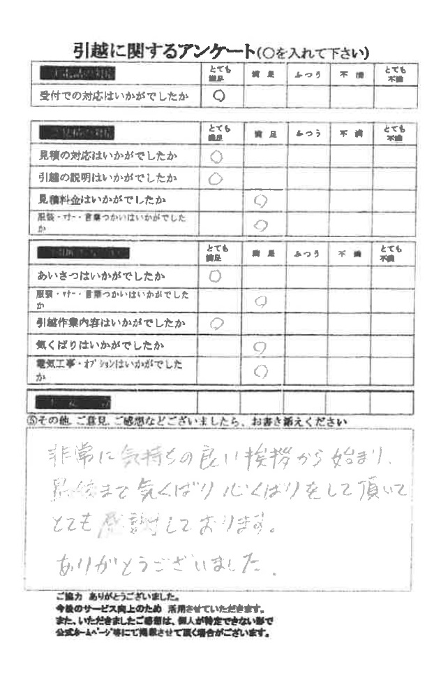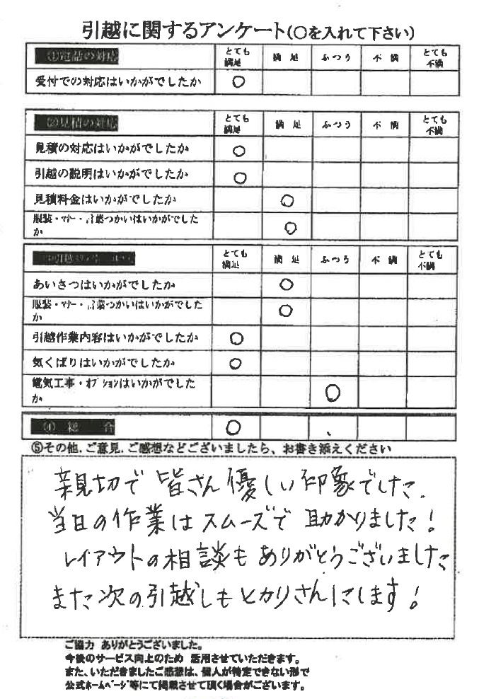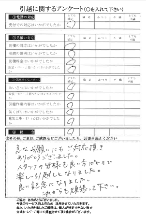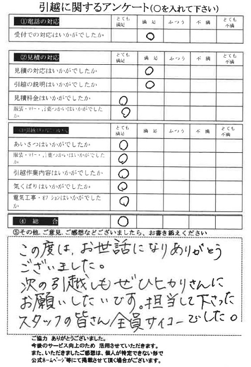 この度は数ある引越業者の中から当社をお選びいただき誠にありがとうございました。又、引越に関するアンケート、全て「とても満足」の評価、ありがとうございます!今後とも末永くよろしくお願い申し上げます。
