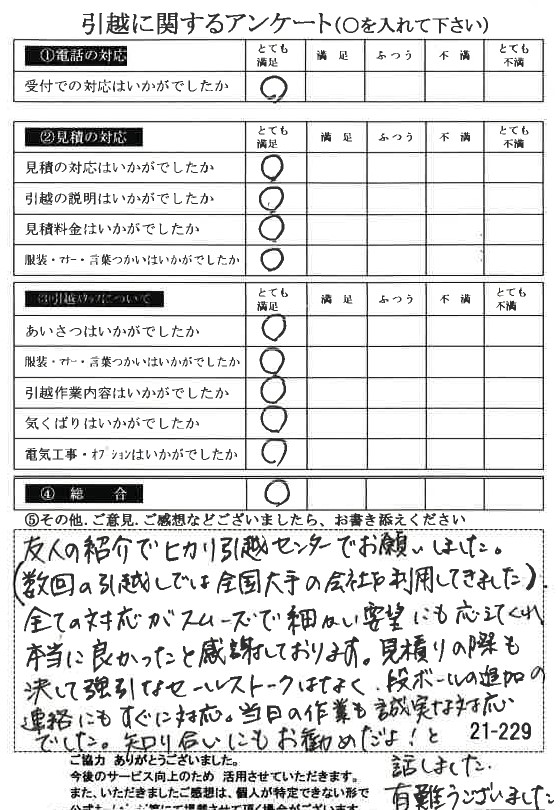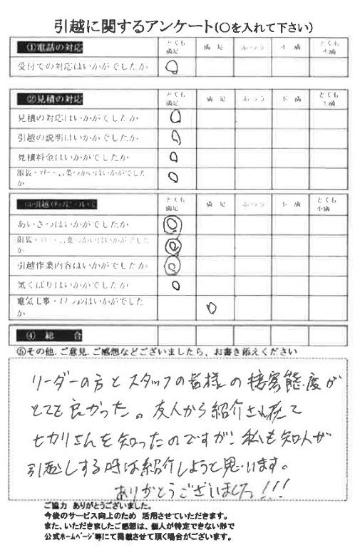 この度は〇〇様からのご紹介で当社をご利用いただき誠にありがとうございました。お褒めのお言葉を頂戴し、ハガキを見てスタッフ一同「満面の笑み」です♪総合評価もご満足いただけて嬉しいです。今後ともヒカリ引越センターをよろしくお願いいたします。