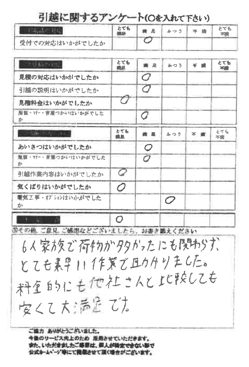 6人家族で荷物が多かったにも関わらず、とても素早い作業で助かりました。料金的にも他社さんと比較しても安くて大満足です。