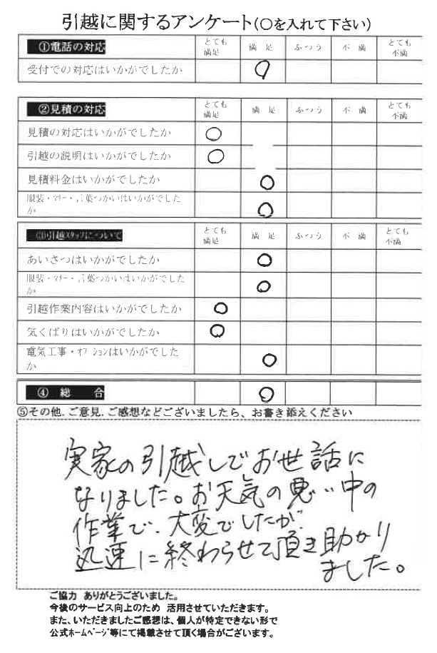 実家の引越しでお世話になりました。お天気の悪い中の作業で大変でしたが、迅速に終わらせて頂き助かりました。
