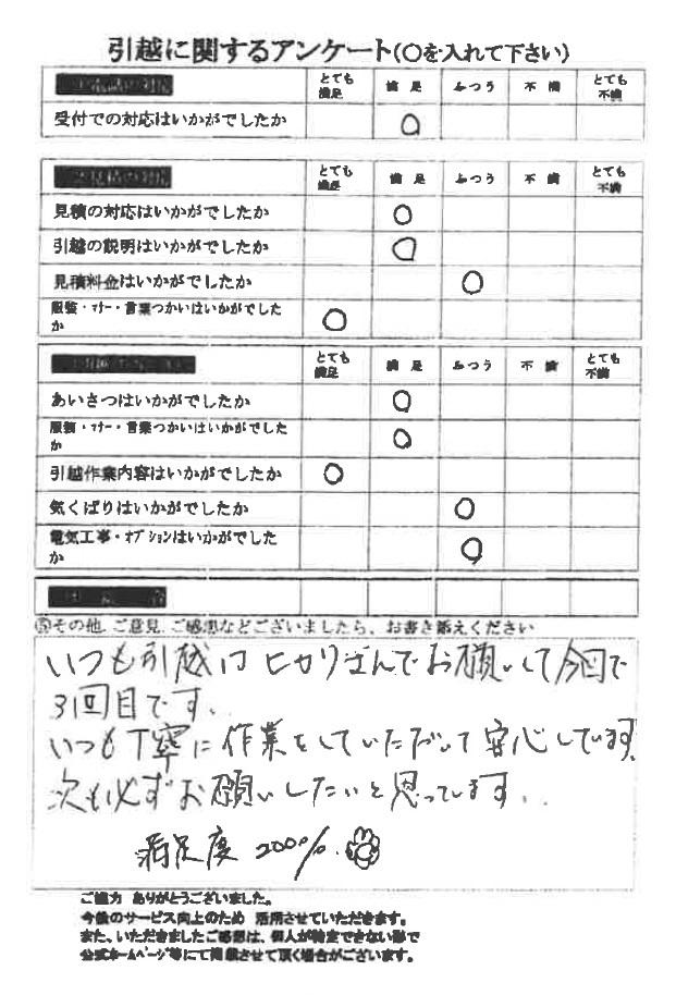ヒカリ引越センターへの評価は「とても満足」を賜りまして大変嬉しく思っております。