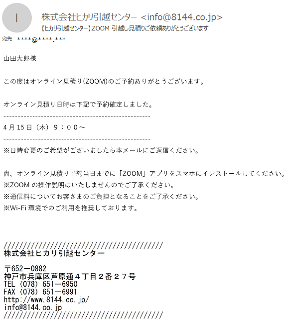 オンライン見積り当日はヒカリ引越センターより登録していただいたメールアドレスにURLをお送りいたします。